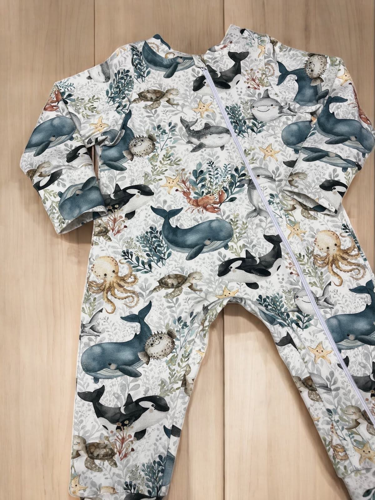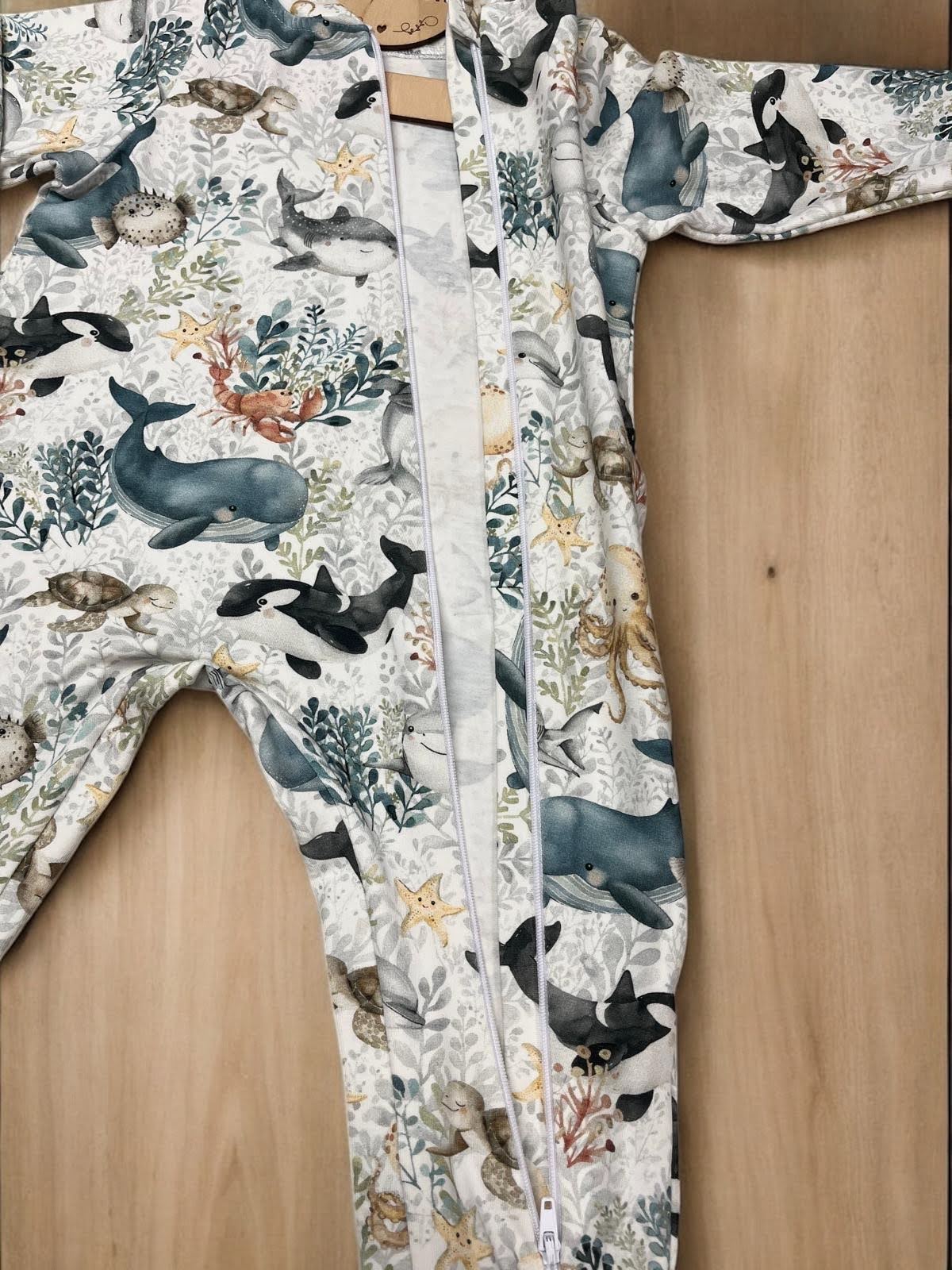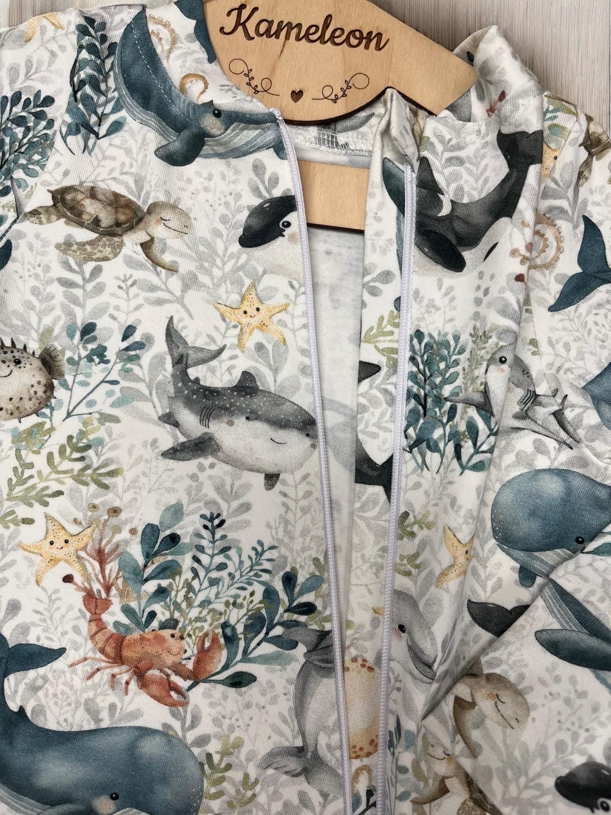 Piżamka zachwyca nie tylko krojem i wykonaniem, ale przede wszystkim wyjątkowym wzorem. Na jersey’owym materiale goszczą wieloryby, żółwie, ośmiornice i inne morskie stworzenia, które przenoszą maluchy w magiczny, podwodny świat. Wzór został dobrany tak, by podobał się zarówno dzieciom, jak i rodzicom – jest subtelny, bajkowy i pełen ciepła.