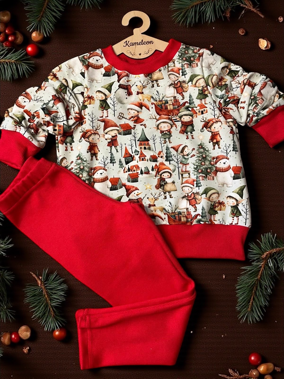 świąteczny komplet dziecięcy, ubrania świąteczne dla dzieci, komplet bluza i spodnie, dresówka organiczna, świąteczna kolekcja dziecięca, zimowa stylizacja dla dziecka, ubranka premium, świąteczne ubrania dla maluchów, prezent świąteczny dla dziecka, komplet zimowy dla dzieci